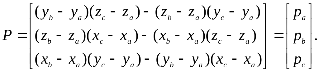 Тоді нормаль P до площини трикутника може бути виражена через векторний добуток двох його сторін як