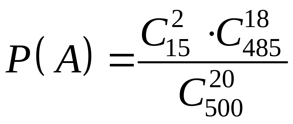 Решение. Так как по условию задачи 20 деталей из 500 извлекаются наудачу, то все возможные варианты извлечения 20 деталей из 500 естественно считать равновозможными и для нахождения требуемой вероятности воспользоваться классической схемой (классическим определением вероятности).