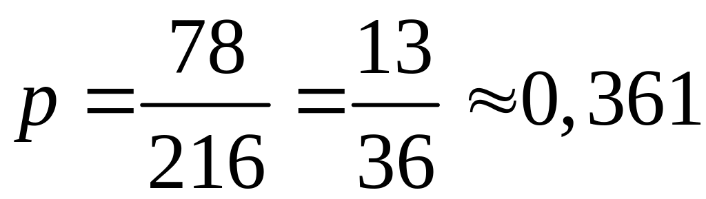 Пример 15. Трем радиостанциям разрешена работа на шести различных частотах. Определить вероятность того, что, по крайней мере, две радиостанции будут работать на одинаковых частотах, если выбор частот производится наугад.