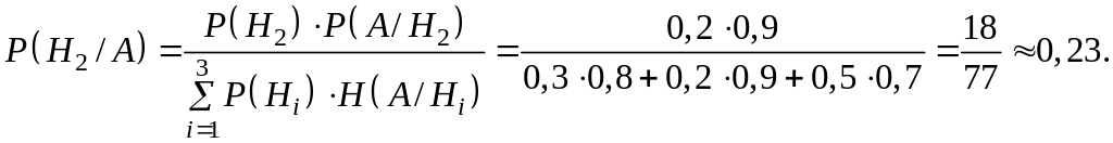 Пример 3. В магазин поступают однотипные изделия с трех заводов, причем первый завод поставляет 30% всех изделий, второй – 20%, а третий – 50%. Среди изделий первого завода 80% первосортных, второго – 90%, третьего – 70%. Куплено одно изделие. Оно оказалось первосортным. Какова вероятность того, что купленное изделие выпущено вторым заводом?
