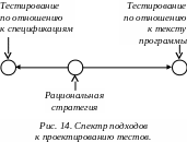 Рациональная стратегия проектирования тестов располагается между этими крайними подходами, но ближе к ее левому краю. Она включает проектирование значительной части тестов по спецификациям, а остальной - по текстам программ. При этом стратегия проектирования по спецификациям базируется на принципах: 1) на каждую используемую функцию или возможность хотя бы один тест, 2) на каждую область и на каждую границу изменения какой-либо входной величины хотя бы один тест, 3) на каждую особую ситуацию, указанную в спецификациях, хотя бы один тест.