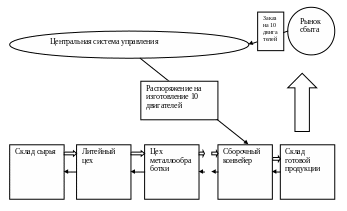 «Тянущая» система представляет собой организацию движения сквозного материального потока, при которой инициатором движения потока выступает производственное звено (цех, отдел, участок и т.п.), получающее указанные материальные ресурсы. При этом центральная система управления не вмешивается в процесс обмена материальными ресурсами между подразделениями, а управляющий сигнал (заказ) на отгрузку материалов на последующую стадию производственно-технологического цикла поступает из подразделения-получателя ресурсов. Таким образом, производственная программа предыдущего звена определяется размером и сроками исполнения заказа последующего. Роль центральной системы управления состоит в постановке задач перед конечным звеном производственной технологической цепи, т.е. управление потоком осуществляется децентрализованно. Принцип действия «тянущей» системы на примере производства двигателей внутреннего сгорания отражает рис. 9.5.