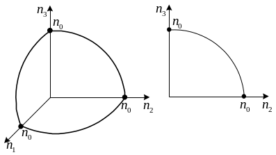 Кожній точці з цілими значеннями відповідає один стан. Точки, що зображають стани молекул, лежать у першому октанті в межах сфери радіуса .