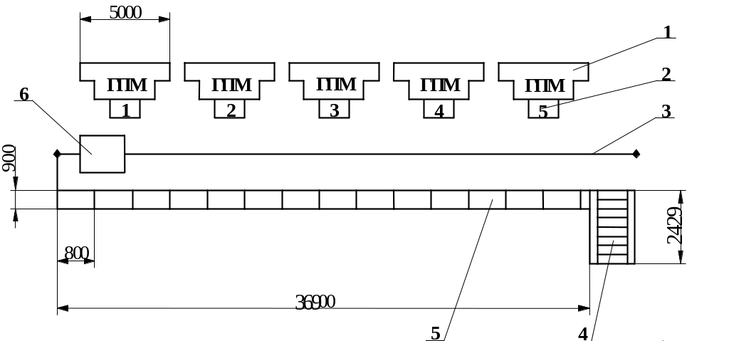 Рисунок 4 – Автоматизированный участок для изготовления деталей типа тел вращения линейной планировки: 1 – производственные модули, 2 – перегрузочные устройства модулей, 3 – подкрановые пути стеллажного робота-штабелера, 4 – конвейер-накопитель, 5 – стеллаж, 6 – робот-штабеллер.