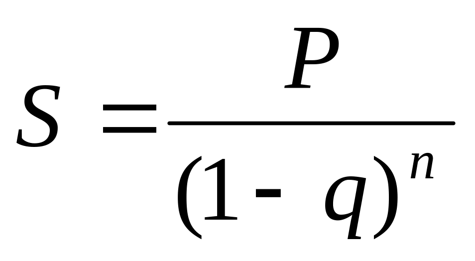 Первоначальную сумму P в начале расчетного периода можно представить как разницу между суммой S1 в конце первого расчетного периода и процентным платежом на эту сумму S1: P=S1-S1q=S1(1-q),
