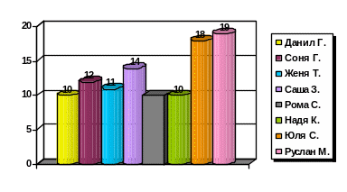 После проведения данной диагностики мы выявили, что у 75%. учащихся средний уровень мотивации к изучению иностранного языка, Они набрали от 7 до 13 баллов. 25% учащихся, а именно Руслан М. и Юля С. имеют высокий уровень мотивации и посещают школу с удовольствием, о чем говорит высокое количество баллов от 14 до 20.