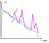 В процессе кристаллизации фосфорной кислоты из растворов (85-87 %) при понижении температуры могут наблюдаться колебания концентрации фосфорной кислоты (см. рисунок). Уменьшение концентрации раствора соответствует нормальному течению процесса кристаллизации, то есть образованию и росту кристаллов. Повышение концентрации раствора означает, что в данный момент времени доминирует обратный процесс – растворение кристаллов. Однако при этом кривая текущей концентрации раствора фосфорной кислоты (кривая 1) не пересекает кривую равновесной концентрации (кривая 2), а находится выше неё при тех же температурных условиях. Таким образом, наблюдаемое периодическое растворение кристаллов происходит в условиях пересыщенного раствора.