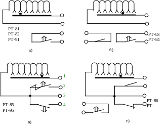 На рисунке 7.8 приведены схемы внутренних соединений реле РТ – 80 (РТ – 90).