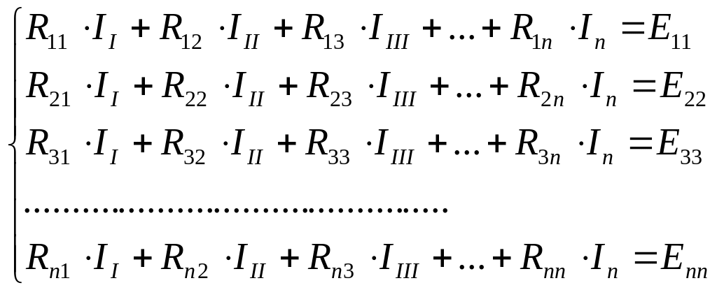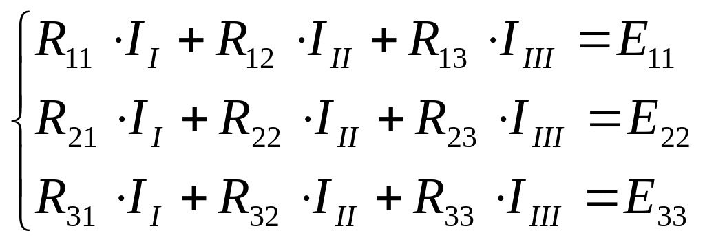 Если в схеме три контура, то систему уравнений для решения методом контурных токов записывают следующим образом: