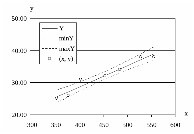 Рассчитаем доверительную зону (интервал), в которой с той или иной вероятностью заключены теоретические средние значения веса новорожденных. Критерий Стьюдента (нормированное отклонение) для уровня значимости α = 0.05, и числа степеней свободы df = п − 1 = 6 составит 2.45. Далее находим границы. Так, для значения x = 352 кг прогноз по уравнению регрессии равен Y = 25.56, а возможное отклонение средней составит: