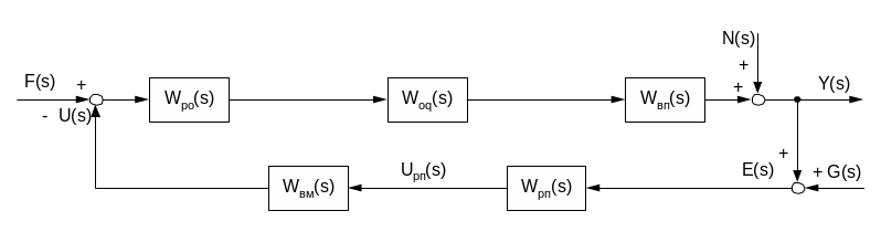 Замінюючи елементи системи (рис.1) передавальними функціями з відповідними індексами, отримаємо її структурну схему (рис.2). При цьому Woq(s) – це передавальна функція об’єкта по каналу регулюючої дії; F(s) – збурення, яке діє на вхід об’єкта з боку регулюючого органу (внутрішнє збурення) ; N(s) – зовнішнє збурення, еквівалентне дії усіх інших збурень, що впливають на об’єкт; E(s) = G(s) – Y(s) - відхилення, або помилка регулювання.