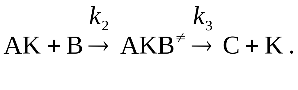 в) вещества А и В реагируют в газовой фазе с образованием промежуточного соединения АВ, которое адсорбируется на поверхности катализатора и затем образует продукт Р;