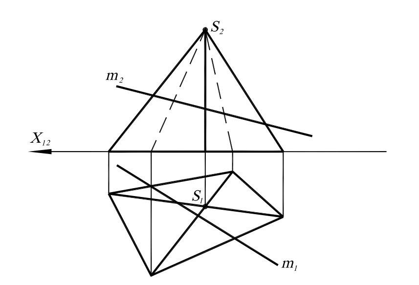7.1. Построить точки пересечения прямой m с поверхностью пирамиды.