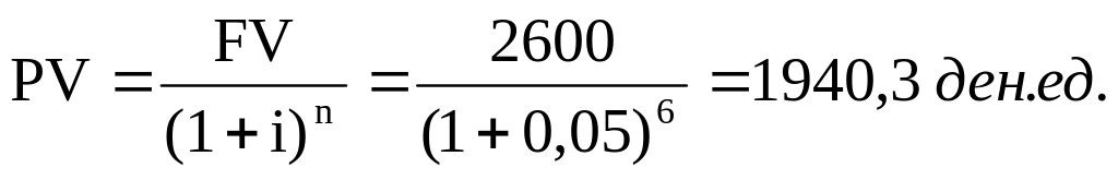 Пример 6. Определить текущую стоимость денег, будущая величина которой через 6 периодов оценивается в 2600 ден.ед. Ставка дисконтирования 5% за период.