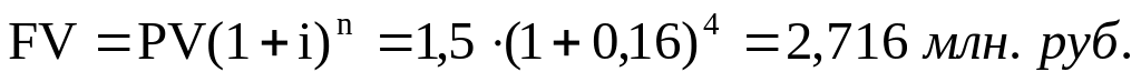 Пример 5. Ссуда 1,5 млн. руб. выдана под сложные проценты на 4 года. Проценты (16 % годовых) начисляются ежегодно и присоединяются к основной сумме долга. Определите сумму задолженности к погашению.