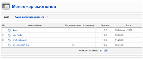На сторінці "Менеджер шаблонов" виберіть потрібний вам шаблон сайту і натисніть кнопку "По умолчанию". Шаблон сайту, вибраний за умовчанням, використовуватиметься для відображення всього сайту.