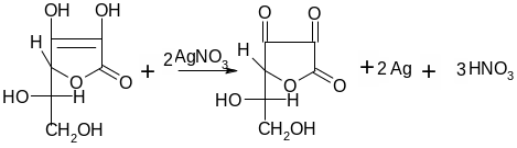 1. При действии на аскорбиновую кислоту раствором нитрата серебра происходит восстановление серебра, при этом аскорбиновая кислота окисляется в кетоформу: