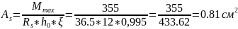 As=N/mg*φ-Rb*Ab/Rs=(847,8/1*0.89-1.95*900)/36.5=(952,6-1755)/36.5=-22 cм2