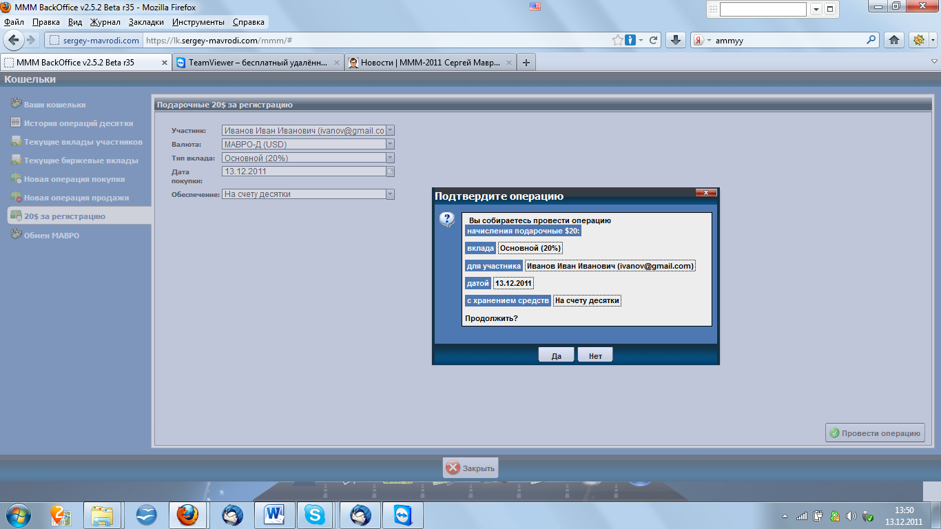 Нужно провести операцию начисления бонусных 20 $. Для этого в разделе кошельки выбираем «20$ за регистрацию». В графе Обеспечение (хранение средств) мы выбираем «На счету десятки». Бонусы руководителя и реферальные бонусы за данную операцию не начисляются. Также первым вкладом 20$ за регистрацию не являются!