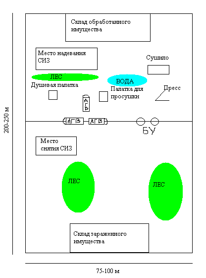 Основные элементы: район ожидания, площадка инструктажа, площадка обработки вооружения, площадка обработки боевой техники, площадка обработки автотранспорта, площадка повторной обработки, район сбора и 2 КРП.