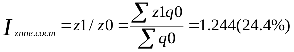 Таким образом, средняя себестоимость единицы изделия в отчетном периоде по сравнению с базисным возросла в 1,244 раза (на 24,4%) ,или в абсолютном выражении — на 1 д.е. Изменение среднего уровня себестоимости произошло за счет двух факторов: