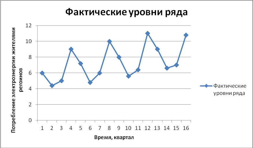 Пусть имеются условные данные об объемах потребления электроэнергии жителями региона за 16 кварталов. (табл. 6.3).
