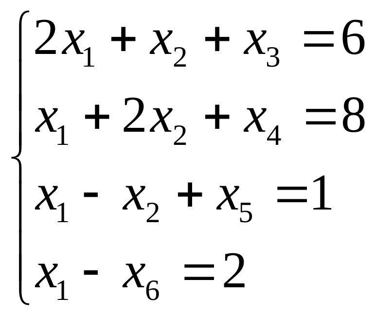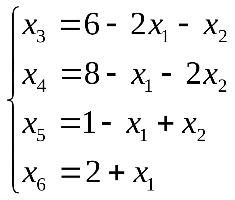 Базисные переменные x3, x4, x5, x6 можно выразить через свободные переменные х1 и х2 и тогда система (3) примет следующий вид: