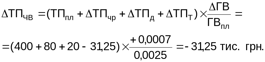 - •Розрахунок впливу чинників на зміну суми витрат на гривню товарної продукції