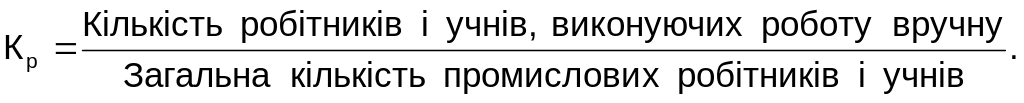 Ці два коефіцієнти дозволяють охарактеризувати діяльність підприємства щодо підвищення механізації і автоматизації виробництва. Під час аналізу організаційно-технічного рівня виробництва особливе значення приділяється оцінці виконання завдань стосовно скорочення ручної праці. Питома вага робітників, зайнятих ручною працею визначається в такий спосіб: