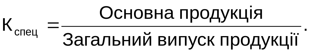 Спеціалізація припускає збільшення питомої ваги продукції, на випуск якої націлене підприємство, тобто продукції, що відповідає профілю підприємства. Коефіцієнт спеціалізації розраховується в такий спосіб: