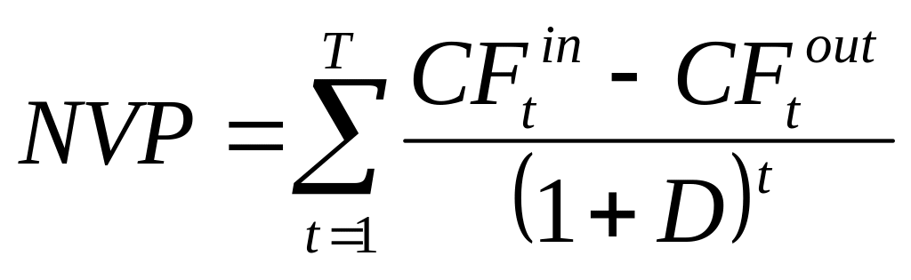 расчета; CFtout— затраты, осуществляемые на том же шаге; Т- горизонт расчета (равный номеру шага расчета, на котором производится ликвидация объекта; NCF = CFtin- CFtout - эффект, достигаемый на