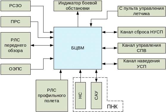 - комплекс вооружения, включающий каналы наведения управляемых средств поражения (УСП), сброса неуправляемых СП (НУСП) и управления стрелково-пушечным вооружением (СПВ);
