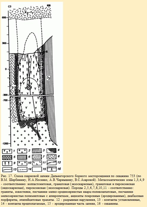 В пределах Дальнегорского рудного поля в Приморье широким развитием пользуются известковые скарны с наложенным свинцово-цинковым и боросиликатным оруденением. В тектоническом отношении рудное поле представляет собой горстовую структуру сложного складчато-глыбового внутреннего строения.