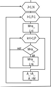 Дана матрица A={ }P*N . Необходимо упорядочить элементы столбцов матрицы А в порядке убывания. Алгоритм сортировки элементов матрицы для этого случая приведен на рис. 23.