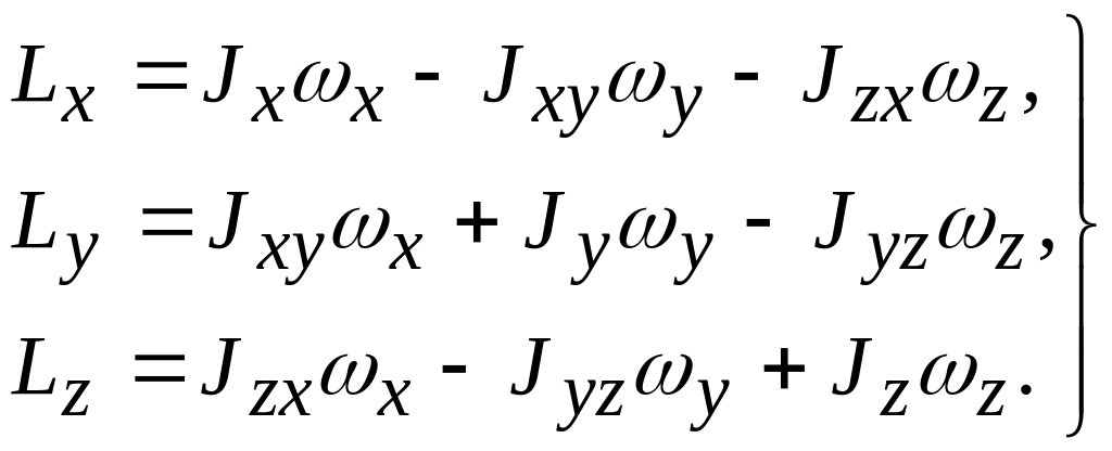 Спроецируем правую и левую части уравнения (8.6) на оси х,у,z, проходящие через точку О,, получаем формулы для вычисления кинетических моментов тела, совершающего сферическое движение относительно осей х, у и z: