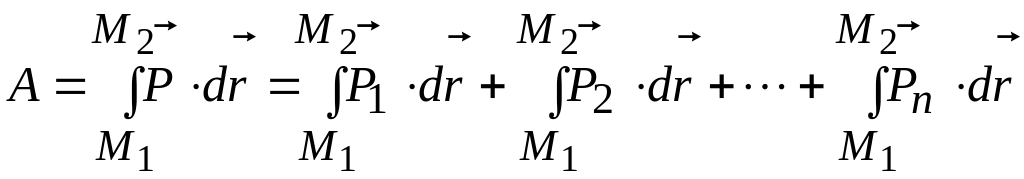 полученная сумма криволинейных интегралов представляет собой сумму работ отдельных сил на конечном участке пути M1M2. Таким образом,