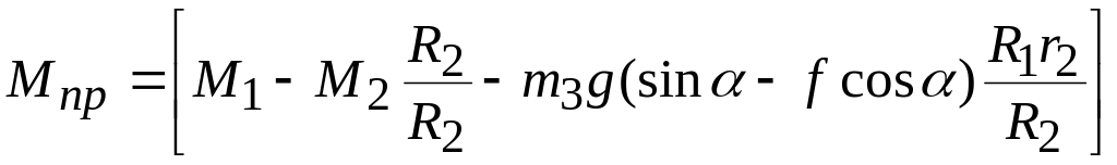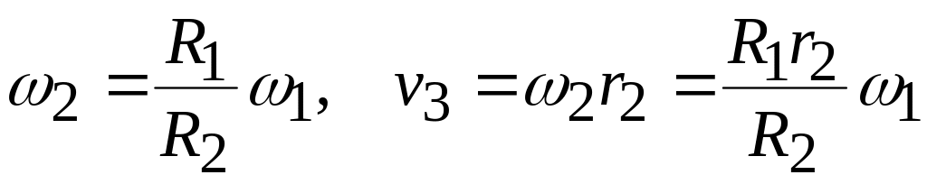 Пример. Груз 3 массы т3 перемещается по наклонной плоскости, образующей угол с горизонтом, электрической лебедкой, состоящей из зубчатого колеса 1 радиуса R1 и находящегося с ним в зацеплении колеса 2 радиуса R2, на одном валу с которым находится барабан радиуса r2, на который навивается трос, прикрепленный к грузу (рис. 5.14).