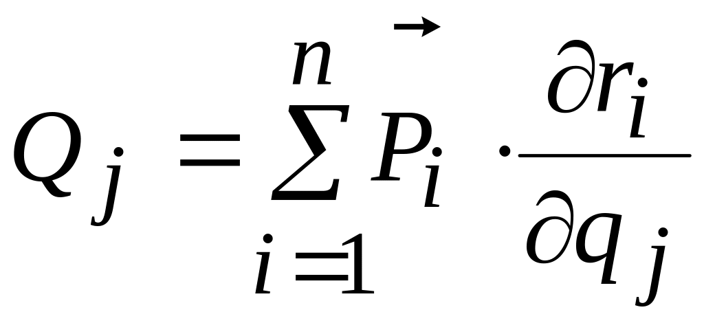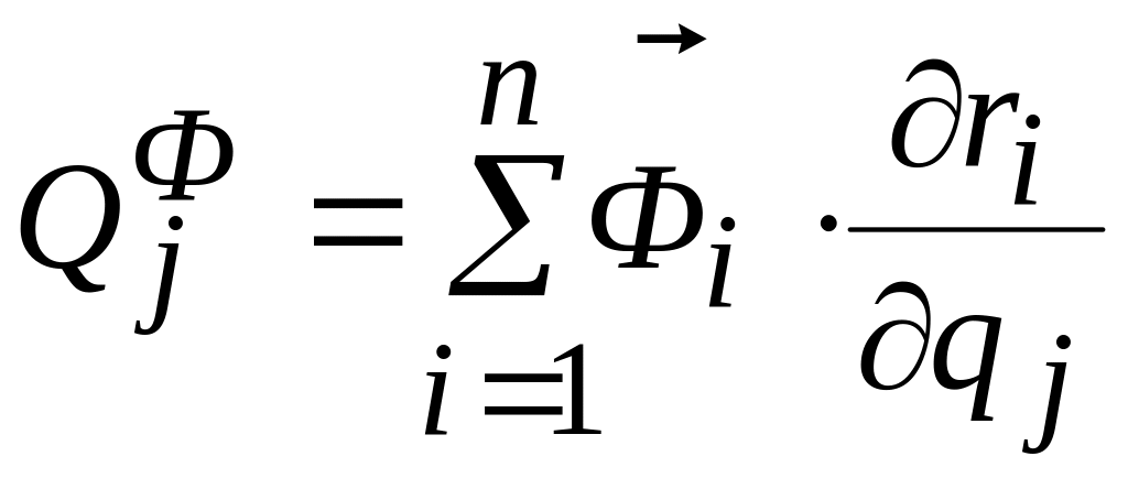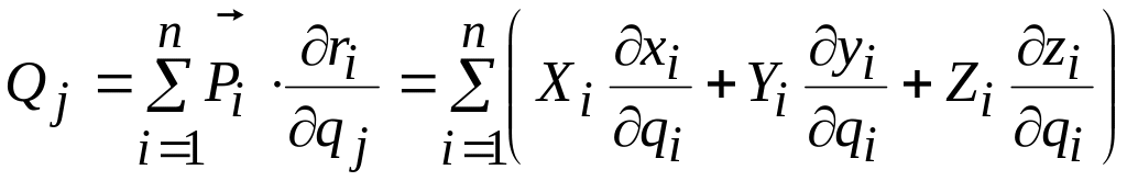 Выражая скалярные произведения в формуле (13.8) через проекции векторов сомножителей на неподвижные оси декартовых координат, получим обобщенную силу Qj в следующем виде:
