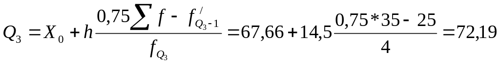 Аналогично медиане вычисляются значения признака, делящие совокупность на 4 равные по численности части – квартили, которые обозначаются заглавной латинской буквой Q с подписным значком номера квартиля. Ясно, что Q2 совпадает с Ме. Для первого и третьего квартилей приводим формулы и расчет по данным табл. 2: