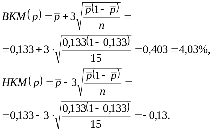 Таким чином, для кожної дослідженої вибірки продукції обсягом n=15 одиниць визначаємо вибіркову частку p кількості невідповідних виробів d за формулою