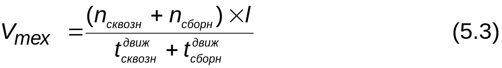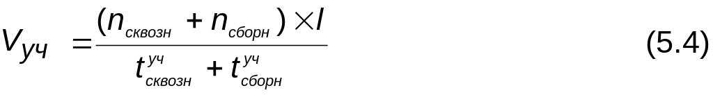 Время нахождения поездов в чистом движении и на участке определяется делением расстояния на скорость техническую и участковую соответственно, которая для сквозных и сборных поездов берется из исходных данных, а для одиночных локомотивов скорость техническая меньше исходной на 5 км/ч, участковая больше исходной на 5 км/ч.