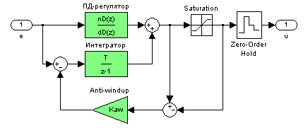 ПД-регулятор Numerator: nD Denominator: dD Sample time: T Интегратор Numerator: [T] Denominator: TI*[1 -1] Sample time: T |