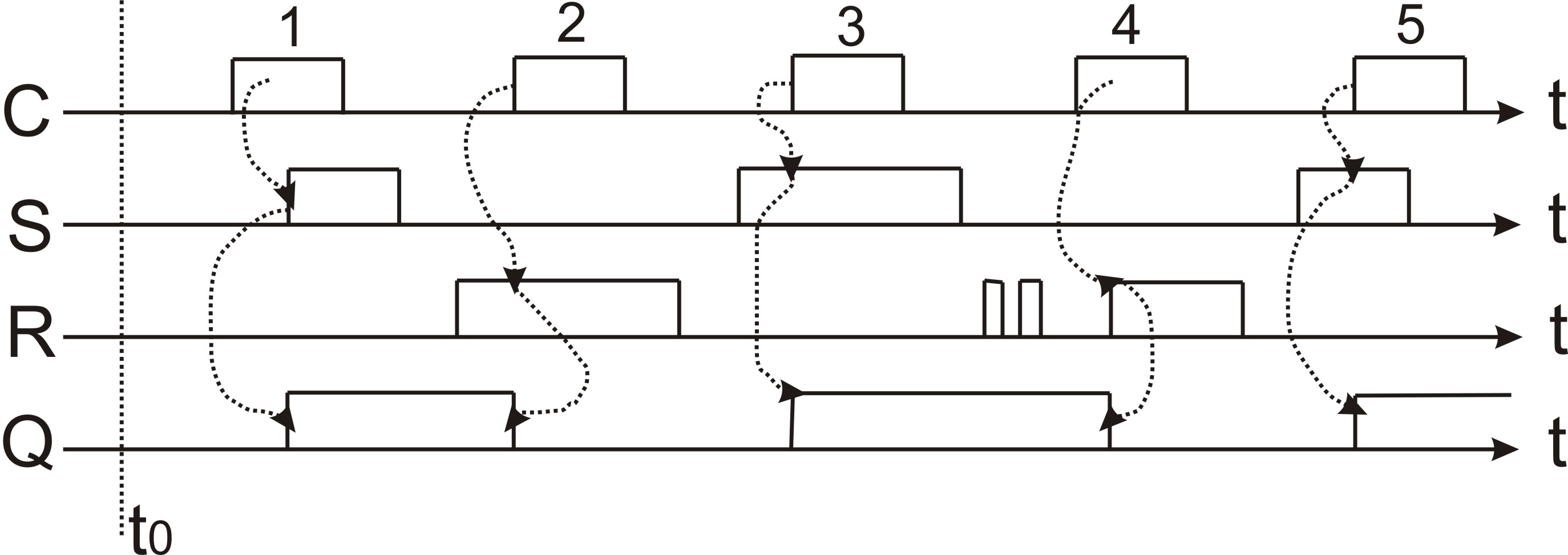 Для обеспечения корректной работы устройства необходимо, чтобы управляющие сигналы на входах R и S оставались неизменны в течении импульса С.