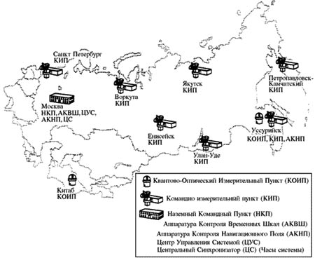 В системе Глонасс в качестве радионавигационной опорной станции используются навигационные космические аппараты (НКА), вращающиеся по круговой геостационарной орбите на высоте ~ 19100 км. Период обращения спутника вокруг Земли равен, в среднем, 11 часов 45 минут. Время эксплуатации спутника – 5 лет, за это время параметры его орбиты не должны отличаться от номинальных значений больше чем на 5%. Сам спутник представляет собой герметический контейнер диаметром 1,35 м и длиной 7,84 м, внутри которого размещается различного рода аппаратура. Питание всех систем производится от солнечных батарей. Общая масса спутника – 1415 кг. В состав бортовой аппаратуры входят: бортовой навигационный передатчик, хронизатор (часы), бортовой управляющий комплекс, система ориентации и стабилизации и так далее.