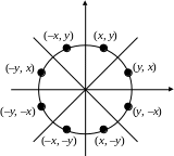 Для упрощения алгоритма растровой развёртки стандартной окружности можно воспользоваться её симметрией относительно координатных осей и прямых y = ± x в случае, когда центр окружности не совпадает с началом координат, эти прямые необходимо сдвинуть параллельно так, чтобы они прошли через центр окружности. Тем самым достаточно построить растровое представление для 1/8 части окружности, а все оставшиеся точки получить симметрией (рис. 2.5).