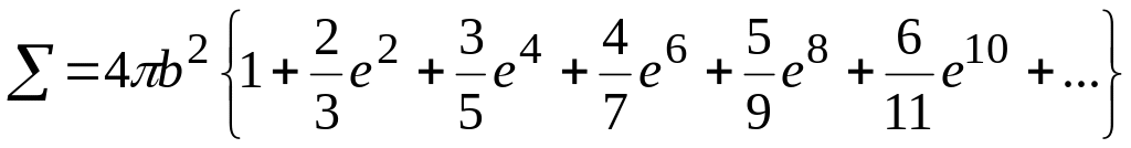 Положив в формуле (13.7) B1 = 0, B2 = 90° и удвоив полученное выражение, получим формулу для вычисления площади ∑ всей поверхности эллипсоида с удержанием любого числа членов, так как закон построения членов ряда совершенно ясен: