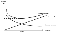 График функции общих затрат имеет вид параболы; поэтому, дифференцируя по q и приравнивая к нулю первую производную, можно найти такое значение q, при котором функция достигает своего минимума, т. е. суммарные затраты по правлению запасами минимизируются. Соответствующая величина запаса носит звание оптимальной партии заказа (EOQ), а формула счета имеет вид