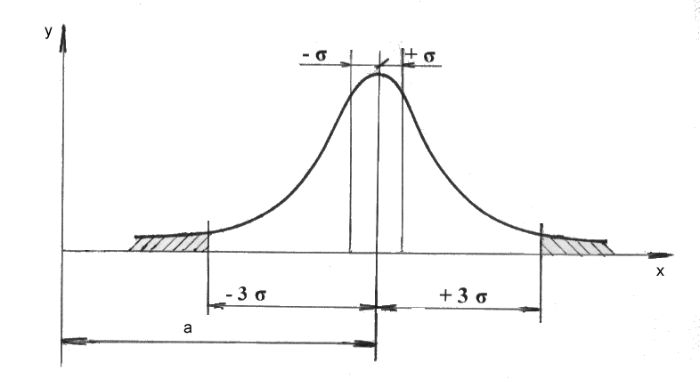 В тоже время существуют другие законы распределения, описывающие случайные величины, природа возникновения которых имеет несколько иной характер. В рассматриваемом случае необходимо упомянуть закон Максвелла, которому подчиняются существенно положительные величины, например: рассеяние значений эксцентриситета, радиальное и торцевое биения, отклонения от соосности, дисбаланс и другие величин, которые не могут принимать отрицательные значения. Для оценки надёжности работы изделий используют закон Вейбулла, который даёт представление о вероятности отказов. Получили распространение также закон Симпсона или закон треугольника и закон равной вероятности. Однако, для обработки результатов наблюдений в основном применяют закон нормального распределения - закон Гаусса. Вероятность попадания величины в заданный интервал можно определить следующим образом. Ветви теоретической кривой нормального распределения (рис. 3.3) уходят в бесконечность, асимптотически приближаясь к оси абсцисс. Площадь, ограничиваемая кривой и осью абсцисс, равна вероятности того, что случайная величина, например, погрешность размера, лежит в интервале ± . Площадь под кривой распределения равна 1 или 100%, она определяется интегралом