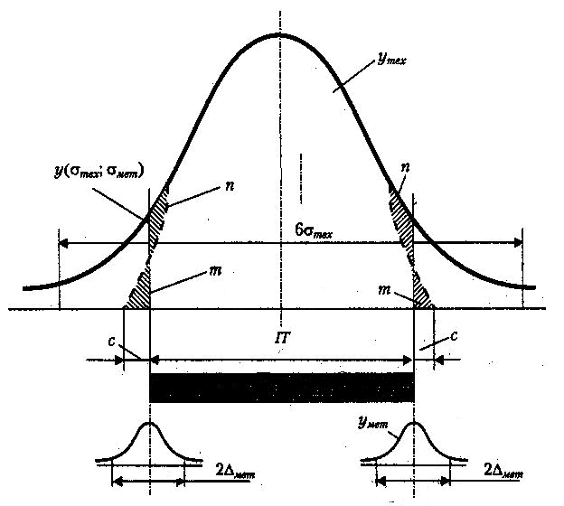 формулой Aмет( m - часть измеренных деталей, имеющих размеры, выходящие за предельные размеры, но принятых в числе годных (неправильно принятые); n - часть деталей, имеющих размеры, не превышающие предельные размеры, но забракованных (неправильно забракованные); c - вероятностная предельная величина выхода размера за предельные размеры у неправильно принятых деталей. На рис. 3.2 представлены кривые распределения размеров деталей (yтех) и погрешностей измерения (yмет), причем центр распределения погрешностей измерения совпадает с границами допуска.