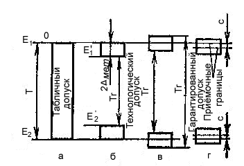 Эксплуатационными и экономическими показателям являются: стоимость и надежность измерительных средств, продолжительность работы до ремонта, время, затрачиваемое на настройку и процесс измерения, масса, габаритные размеры и др. В большинстве случаев, чем выше требуемая точность средства измерения, тем оно массивнее и дороже, тем выше требования, предъявляемые к условиям его использования. 3.9.3 Точность средств измерения и контроля Точность средств измерения и контроля оказывает влияние на использование табличного допуска T на изготовление детали, как бы уменьшая его (рис. 3.1, а). Если представить, что измерительное средство - идеально, т.е. не имеет погрешностей и настроено на границы поля допуска E1 и E2, то допуск T оставался бы постоянным.